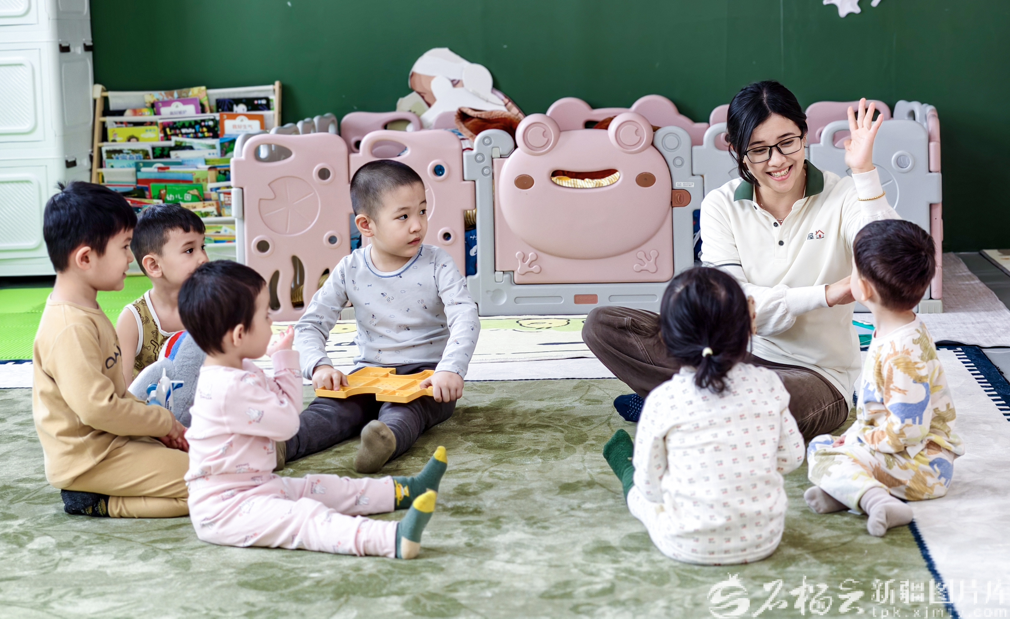 2月27日,老師在烏魯木齊市天山區(qū)賽馬場街道賽馬場西社區(qū)鄰里中心設立的親子中心與小朋友玩耍。