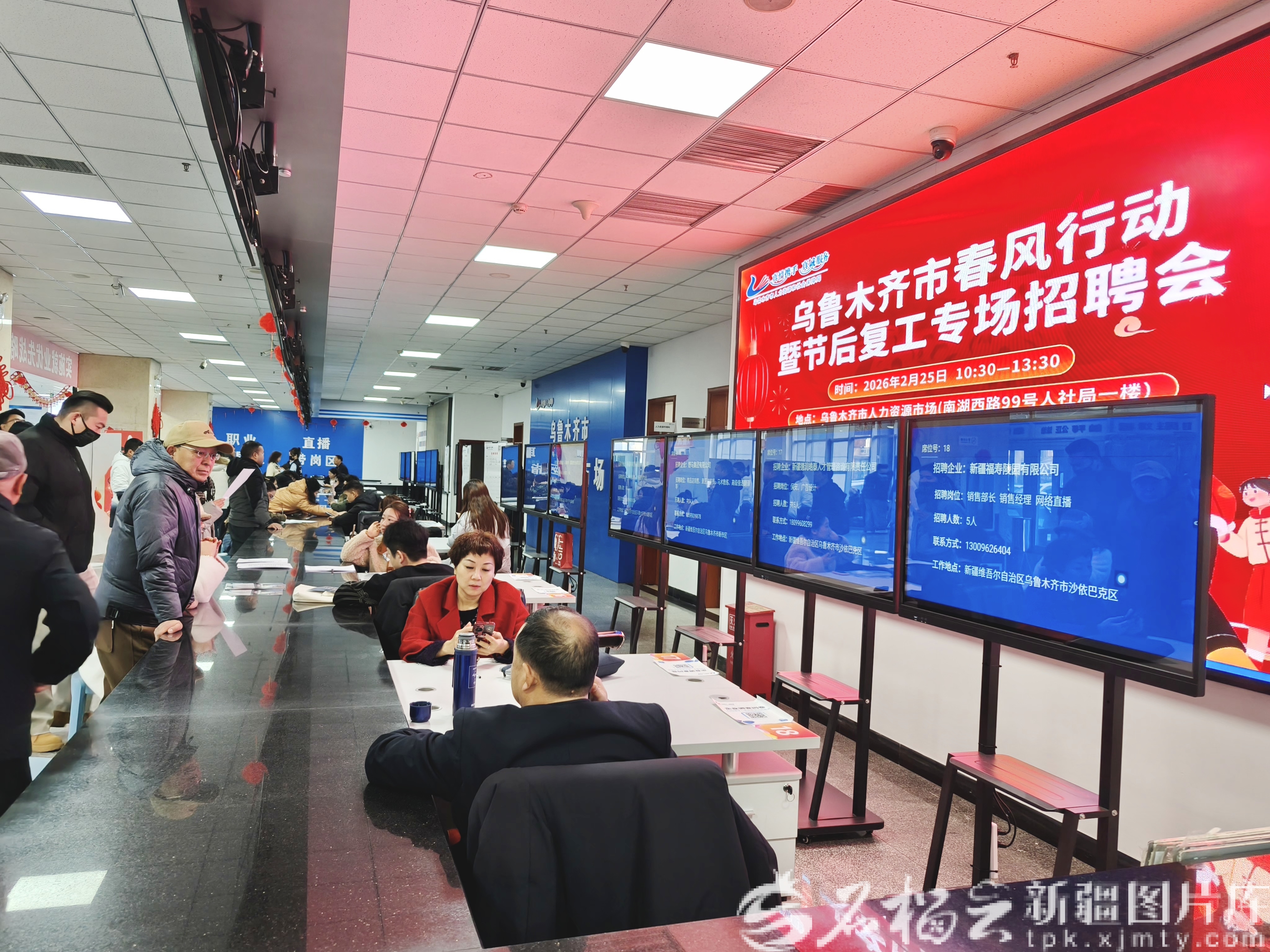 2月25日,在烏魯木齊市人力資源市場春風(fēng)行動暨節(jié)后復(fù)工專場招聘會現(xiàn)場,求職者在了解招聘信息。烏魯木齊市公共就業(yè)服務(wù)中心供圖