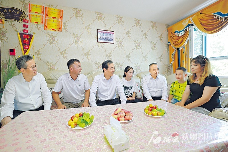 7月3日至6日,自治區(qū)黨委書記、兵團黨委第一書記陳小江,自治區(qū)黨委副書記、自治區(qū)主席艾爾肯·吐尼亞孜來到和田地區(qū)、阿克蘇地區(qū)和兵團第十四師昆玉市、第一師阿拉爾市調(diào)研。這是7月4日,陳小江、艾爾肯·吐尼亞孜在兵團第十四師昆玉市224團和泰新區(qū),走進居民艾力·艾麥爾家中,與一家人親切拉家常,詢問工作、收入、子女教育情況。天山網(wǎng)-新疆日報記者 崔志堅攝