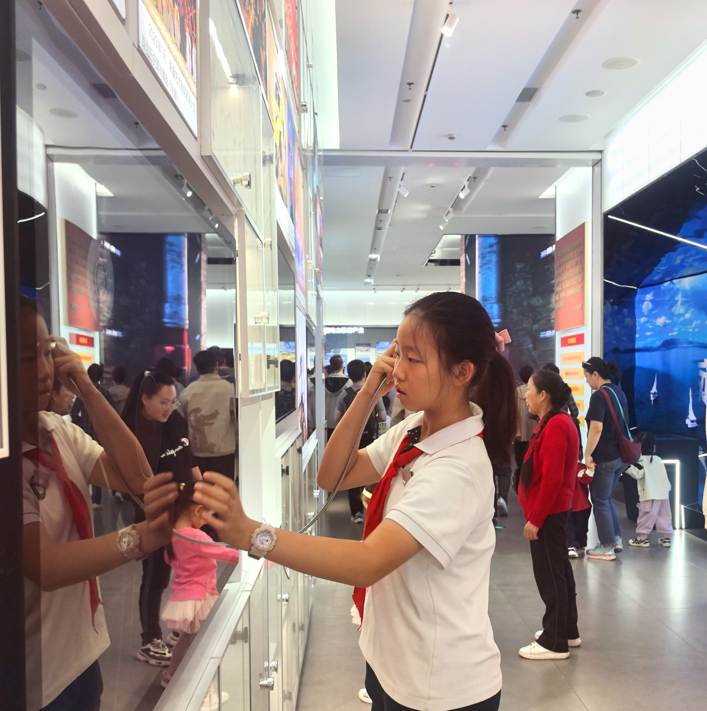 展廳里一段短視頻讓不少觀眾駐足:今年暑假,和田小姑娘帕提曼罕·排日海提第一次來到祖國的心臟北京天安門。她踮起腳尖,目光注視冉冉升起的五星紅旗。那一刻淚水淌過臉頰:“五星紅旗在藍(lán)天中是一抹鮮艷的紅,也是在我心中永遠(yuǎn)抹不去的紅?!?/p>