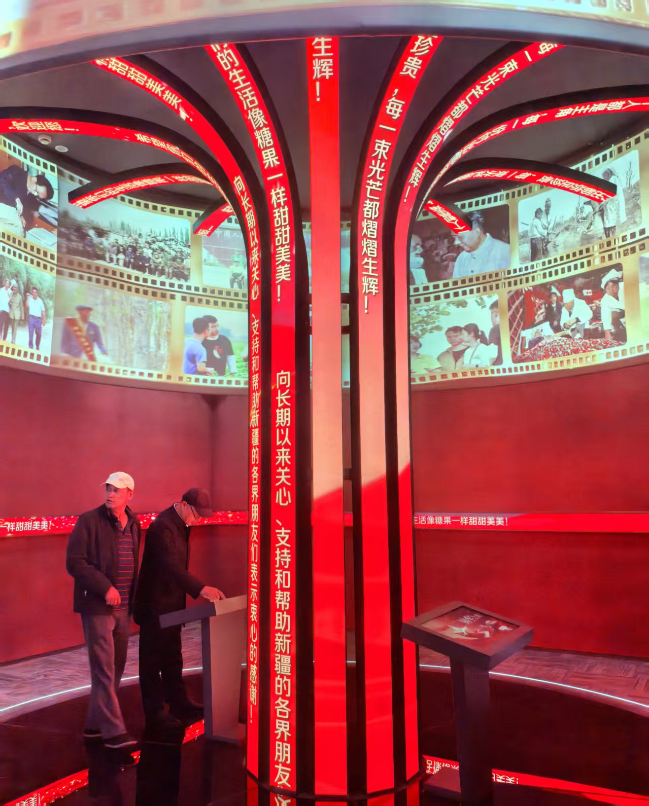 展覽特別設(shè)置的時光“傳送機(jī)”墻面,通過32組新舊對比影像,不僅展現(xiàn)了新疆地理風(fēng)貌的巨變,更彰顯了發(fā)展理念的升華——基礎(chǔ)設(shè)施跨越發(fā)展、特色產(chǎn)業(yè)拔節(jié)生長、民族團(tuán)結(jié)之花常開、文化遺產(chǎn)活態(tài)傳承。這種肉眼可見的蛻變,讓每一位觀眾都能觸摸到發(fā)展的溫度,感受到這片土地的蓬勃生機(jī)。