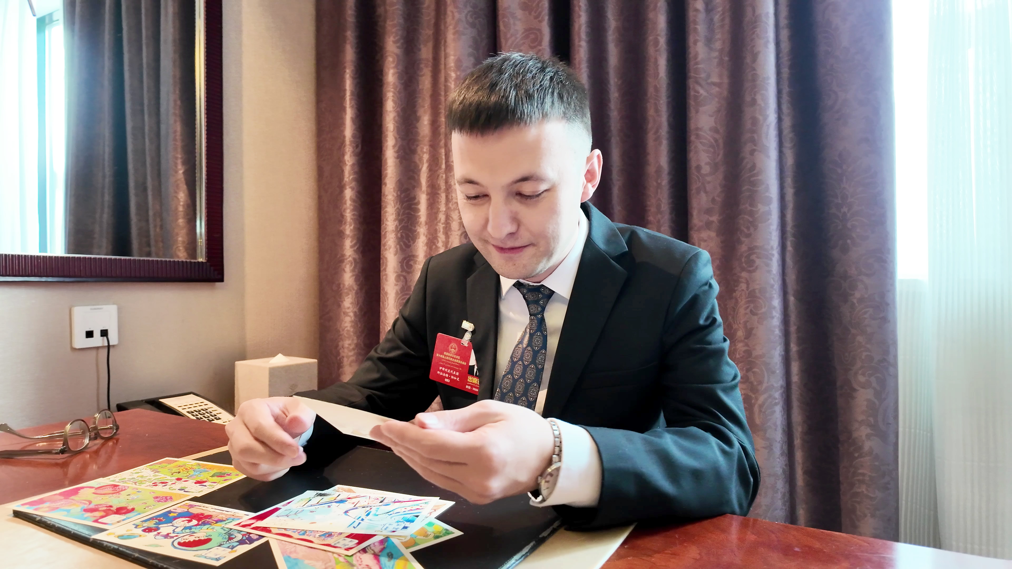 1月27日,自治區(qū)人大代表、新疆蘇齊農(nóng)業(yè)節(jié)水規(guī)劃設(shè)計(jì)研究院有限公司董事長(zhǎng)阿力甫江·阿不里米提展示為“童繪新疆”小作者寫的明信片。(攝影:仲兆豐)