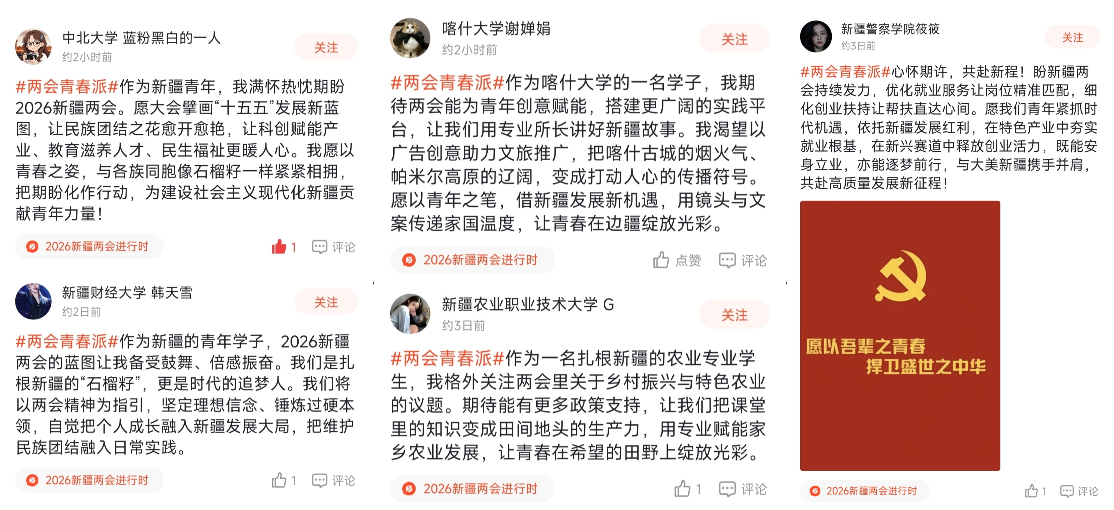 為助力青年朋友們牢牢把握時代機遇、融入新疆發(fā)展大局,1月24日,石榴云客戶端聯(lián)合自治區(qū)團委、石榴云新疆高校新媒體工作室(聯(lián)盟),推出“兩會青春派”2026年自治區(qū)兩會石榴圈話題征集活動,截至28日,已累計有千余位高校師生參與話題討論,暢談新期待、共話新愿景。