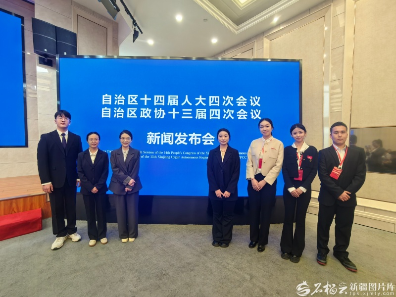 1月25日,西部計劃志愿者、北京大學(xué)研究生支教團成員與石榴云實習(xí)生,在新疆兩會新聞中心合影。