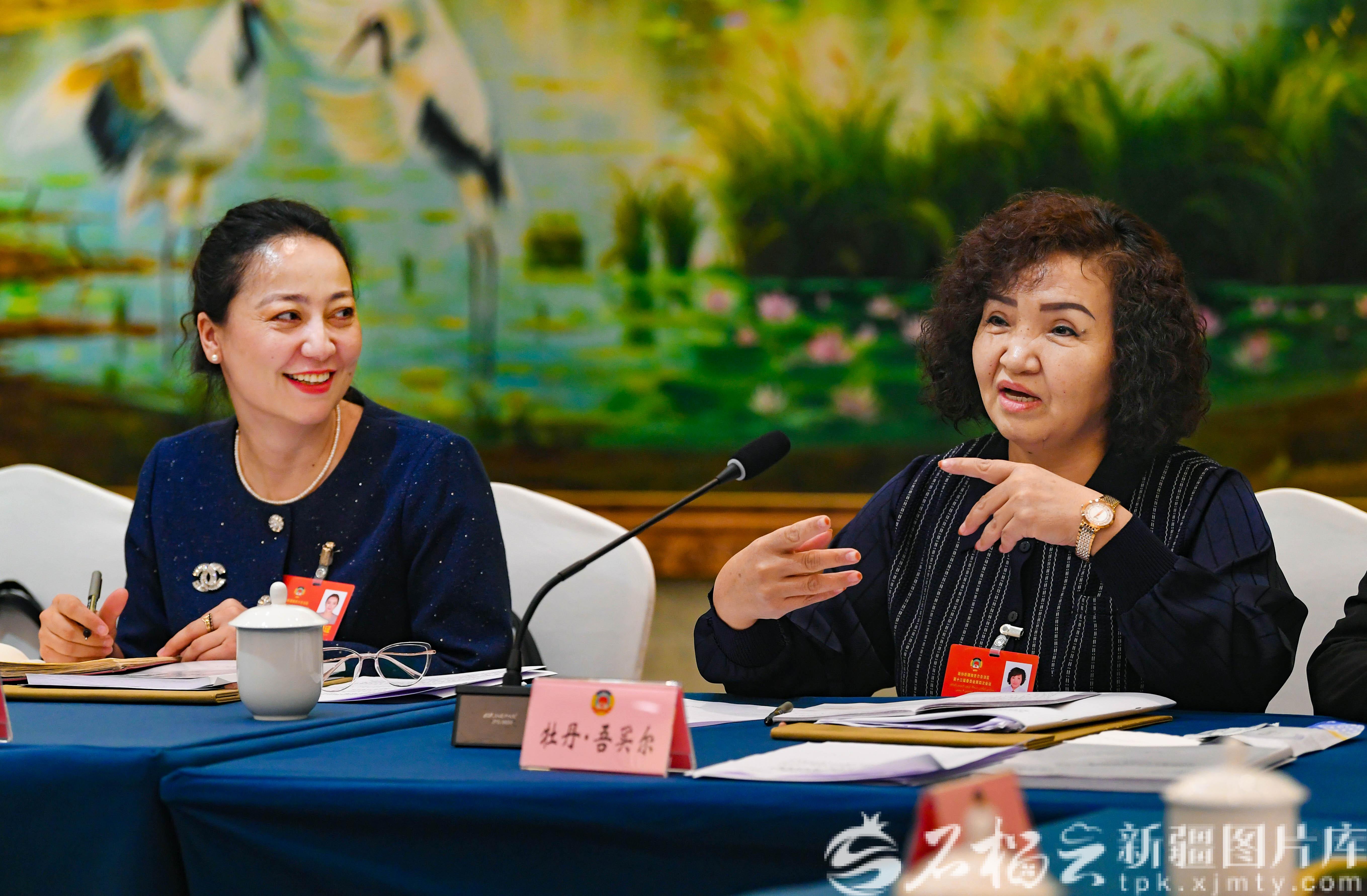 1月29日,農(nóng)業(yè)界、環(huán)境資源界委員分組討論政府工作報(bào)告、自治區(qū)“十五五”規(guī)劃綱要草案、兩院工作報(bào)告等。牡丹·吾買爾委員(右)圍繞加大水資源高效利用等內(nèi)容發(fā)言。天山網(wǎng)—新疆日?qǐng)?bào)記者 約提克爾·尼加提攝