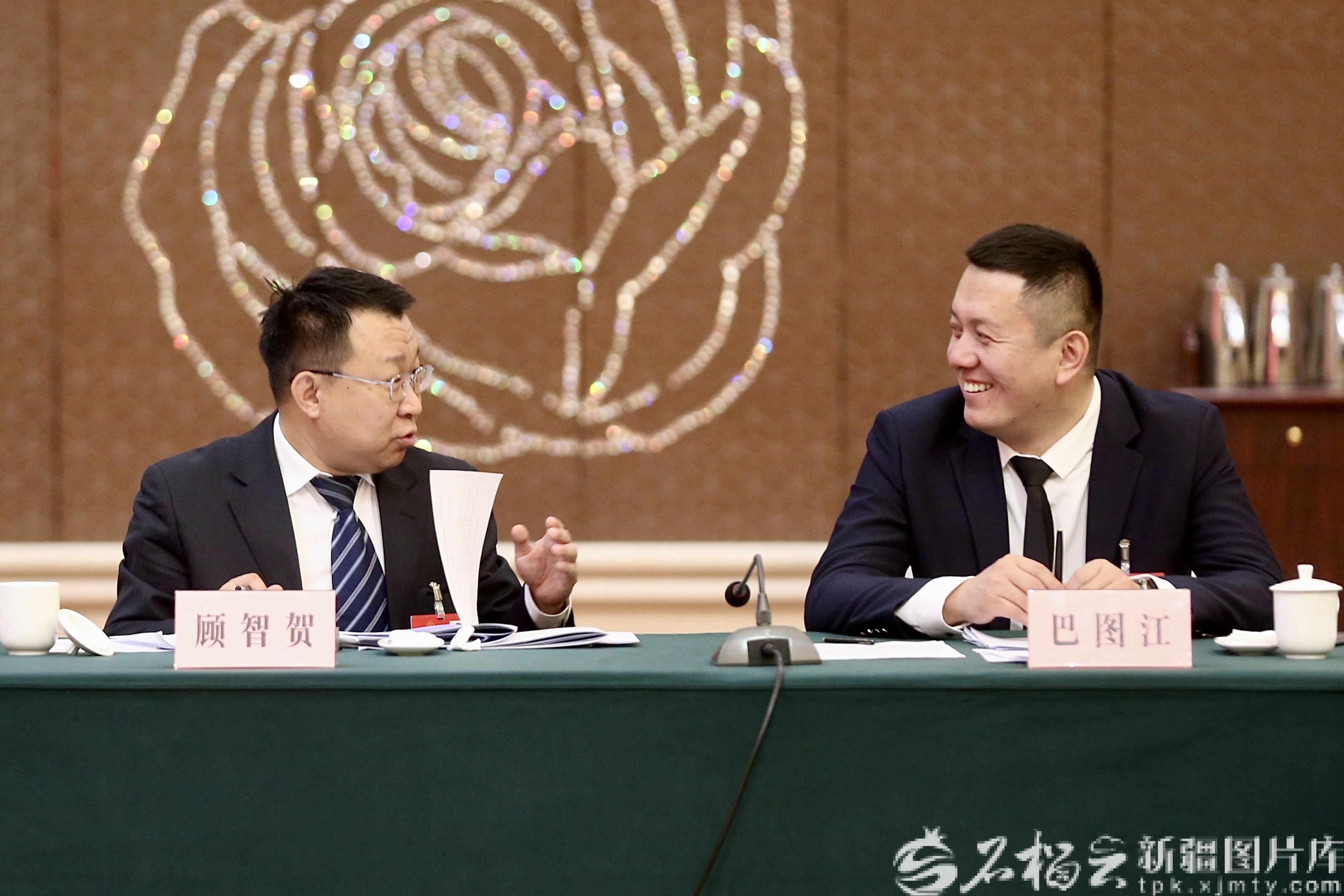 1月30日,烏魯木齊代表團(tuán)審議時(shí),顧智賀代表和巴圖江代表一起交流。天山網(wǎng)-新疆日?qǐng)?bào)記者 李瑞攝