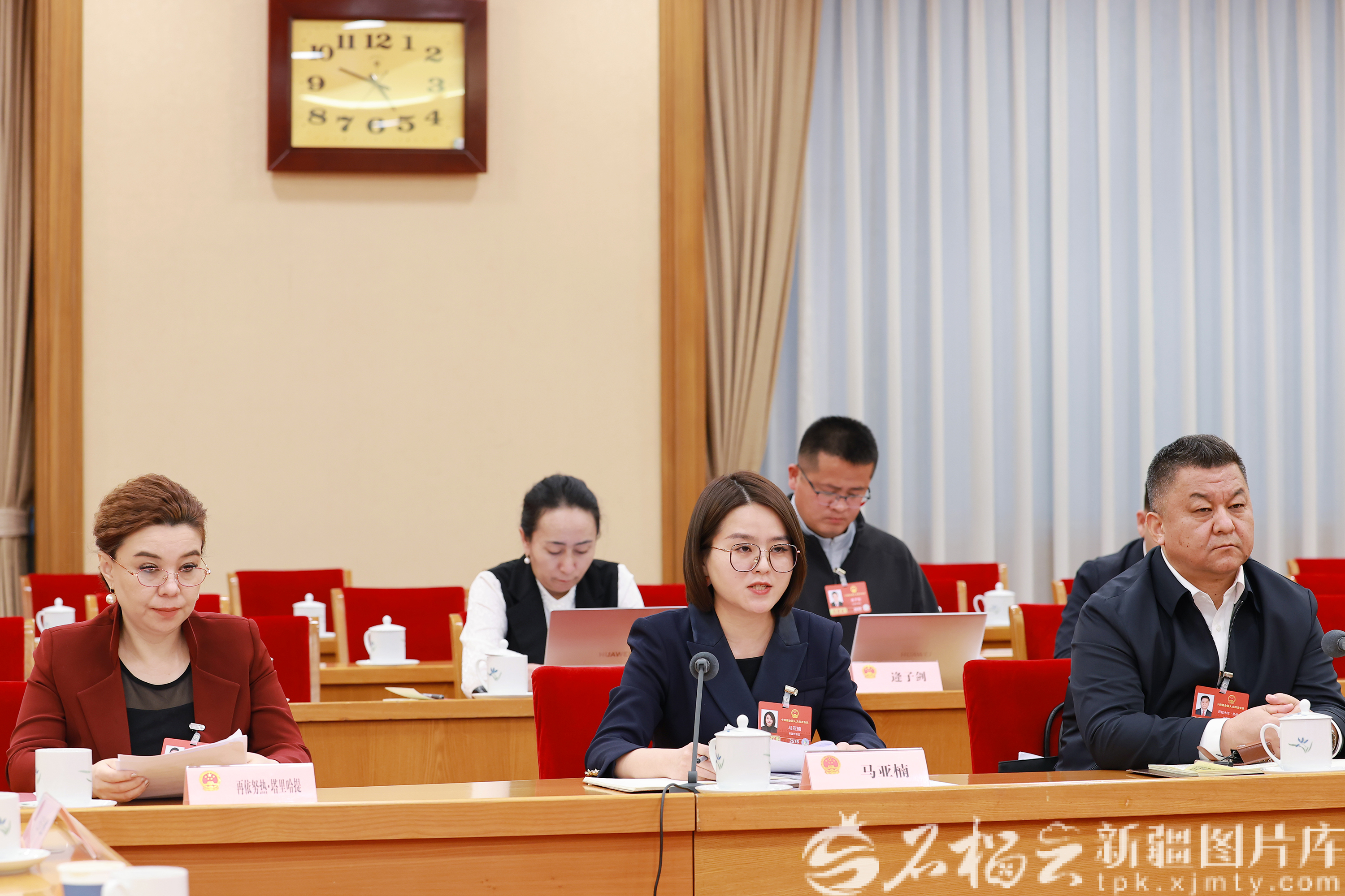 3月9日下午,十四屆全國(guó)人大四次會(huì)議新疆代表團(tuán)舉行小組會(huì)議,審議全國(guó)人大常委會(huì)工作報(bào)告、全國(guó)人大常委會(huì)關(guān)于法律清理工作情況和有關(guān)法律和決定處理意見的報(bào)告。圖為馬亞楠代表(前中)在發(fā)言時(shí)就適時(shí)啟動(dòng)動(dòng)物防疫法執(zhí)法檢查提出建議。天山網(wǎng)-新疆日?qǐng)?bào)記者 崔志堅(jiān)攝