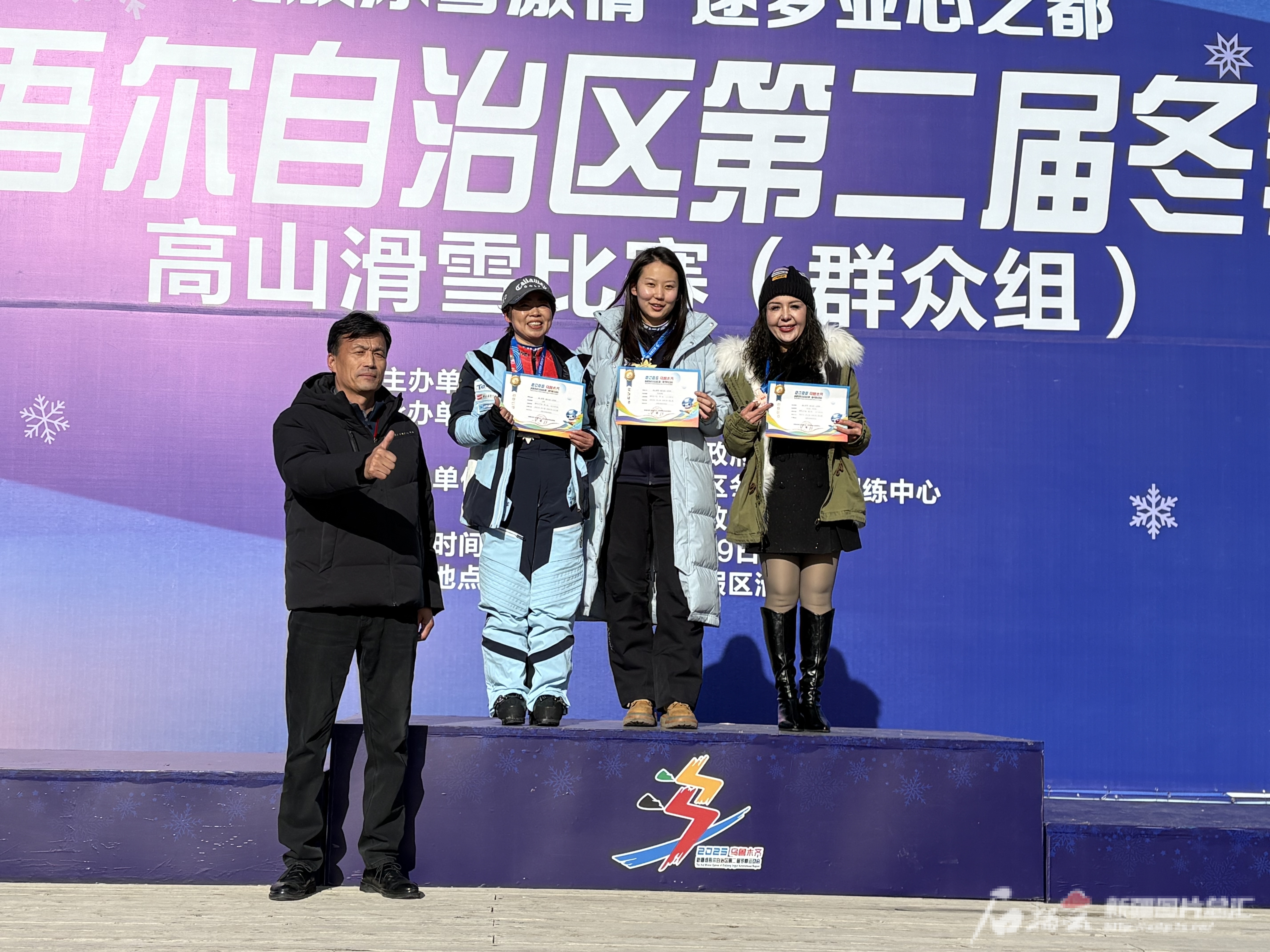 1月7日,艾比熱·阿爾慶(右一)站在自治區(qū)第二屆冬季運(yùn)動(dòng)會(huì)高山滑雪(群眾組)的領(lǐng)獎(jiǎng)臺(tái)上。天山網(wǎng)-新疆日?qǐng)?bào)記者 王晶晶攝