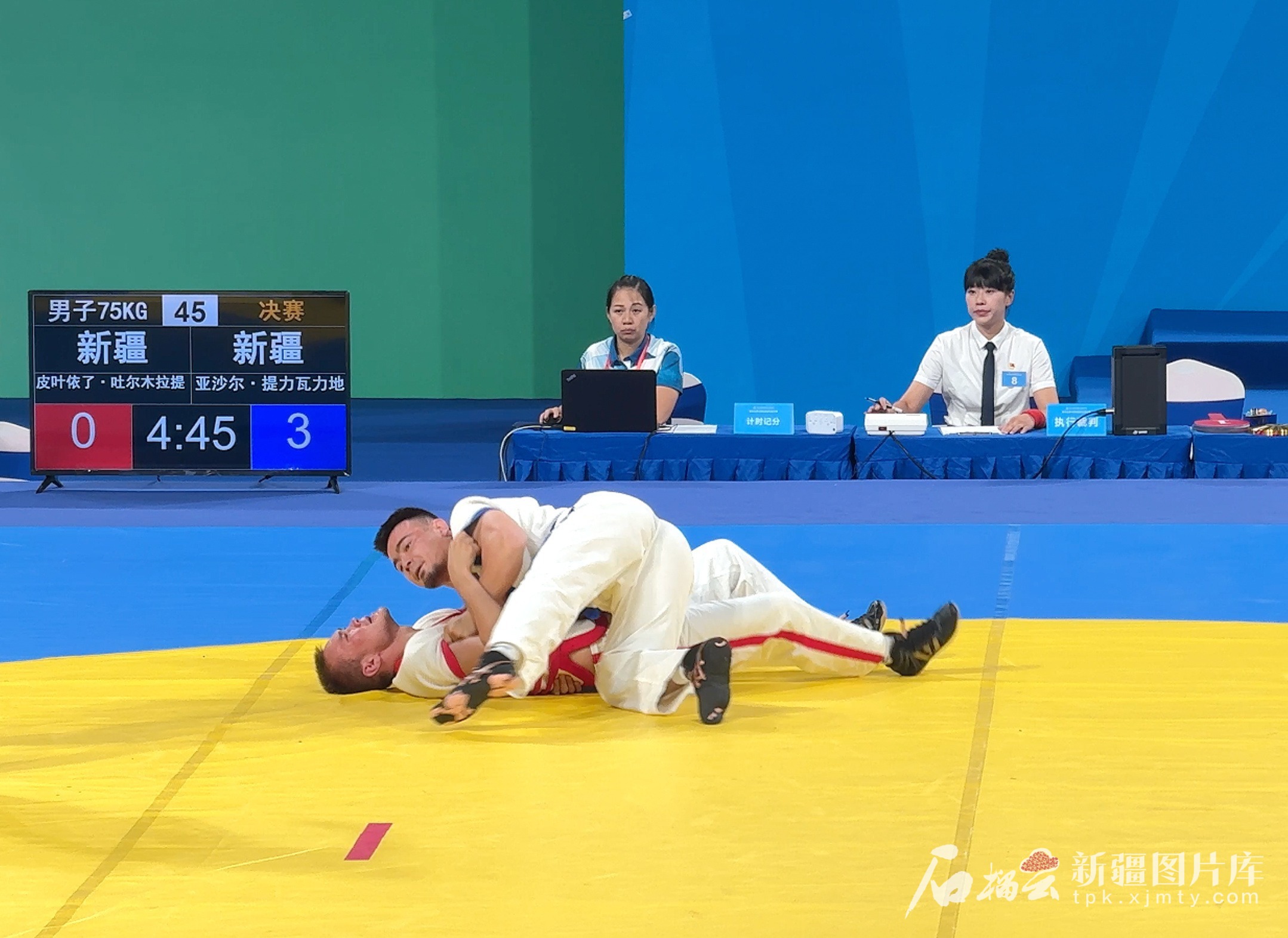 新疆隊(duì)運(yùn)動(dòng)員亞沙爾·提力瓦力地(藍(lán)方)與皮葉依了·吐爾木拉提在男子75公斤決賽中奪得1金1銀。天山網(wǎng)-新疆日?qǐng)?bào)記者 董亮攝