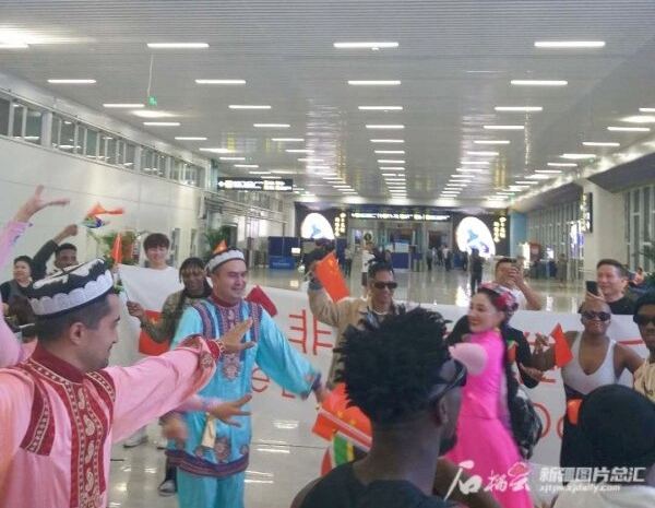 天山網(wǎng)-新疆日報訊(記者瑪依古麗·艾依提哈孜報道)7月23日晚,參加第六屆中國新疆國際民族舞蹈節(jié)的南非埃爾維斯舞蹈藝術(shù)團(tuán)舞蹈演員抵達(dá)中國新疆。一走出烏魯木齊地窩堡國際機(jī)場T3航站樓,來自萬里之外的藝術(shù)家們立刻被新疆人的熱情與好客所震撼。一場快閃,隨之上演。