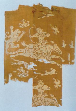 吐魯番市阿斯塔那唐墓出土的煙色地狩獵紋印花絹。自治區(qū)博物館提供
