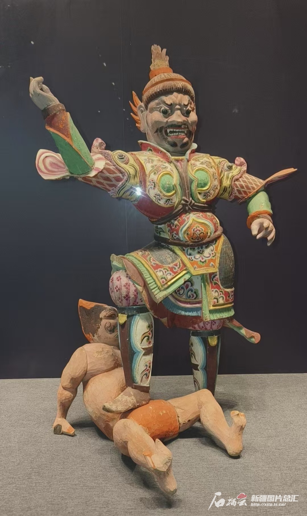 “木料會(huì)朽,色彩會(huì)褪,守護(hù)的誓言卻刻進(jìn)年輪”。如今,在新疆博物館的展廳中央,這位西域天王依然威嚴(yán)矗立——他怒目圓睜,氣勢(shì)凜然,而腳下小鬼腹部的榫卯結(jié)構(gòu)歷經(jīng)千年仍緊密咬合,宛若當(dāng)年。這嚴(yán)絲合縫的,不僅是精妙的木工技藝,更是中原與西域早已水乳交融的歷史血脈。