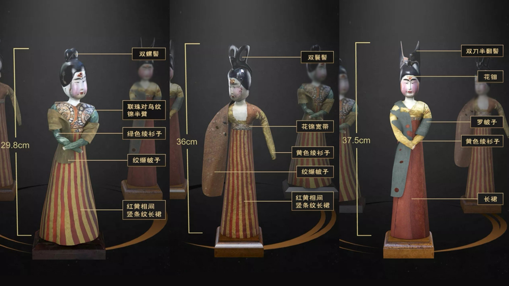 這些木俑完美展現(xiàn)了盛唐時期的藝術交融與工藝精髓:木俑發(fā)髻間斜插的步搖,正是長安城教坊司最時興的流行款式;身著薄如蟬翼的絹衣,衣飾紋樣融合了波斯粟特商隊帶來的聯(lián)珠紋與中原傳統(tǒng)纏枝花紋;采用紙捻成臂的精巧構造,雙臂設計暗合敦煌壁畫中飛天反彈琵琶的飄逸姿態(tài)。