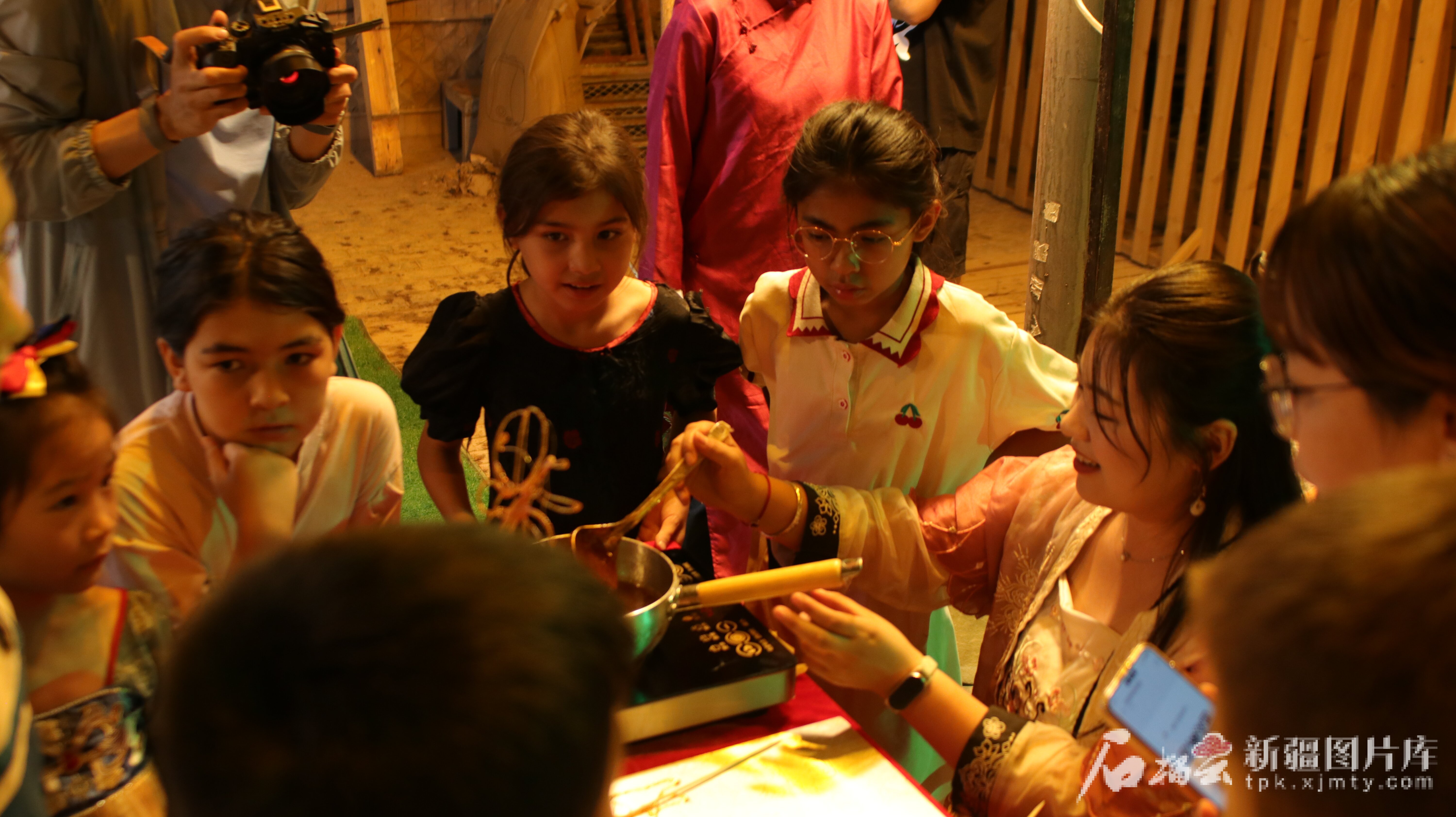 7月1日,喀什古城景區(qū)內(nèi),小朋友好奇地圍坐在“糖影繪夢(mèng)”社會(huì)實(shí)踐團(tuán)隊(duì)的糖畫桌前。圖片由受訪團(tuán)隊(duì)提供