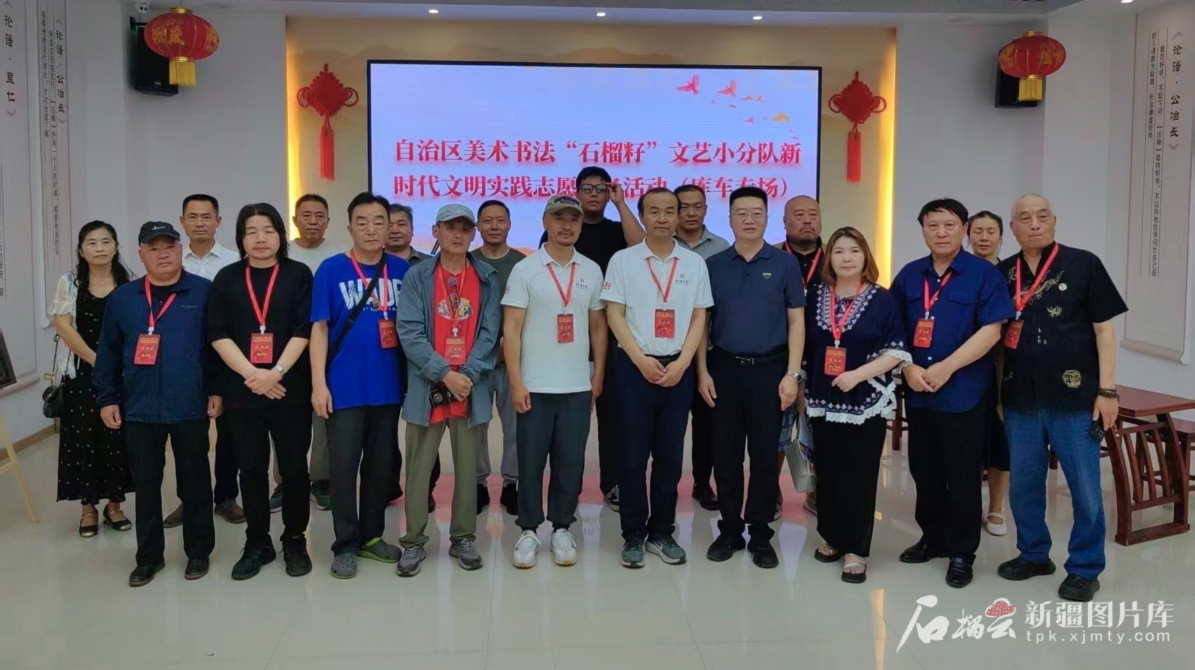 自治區(qū)美術(shù)書(shū)法“石榴籽”文藝小分隊(duì),在庫(kù)車(chē)市捐贈(zèng)作品進(jìn)行合影留念。紅梅攝