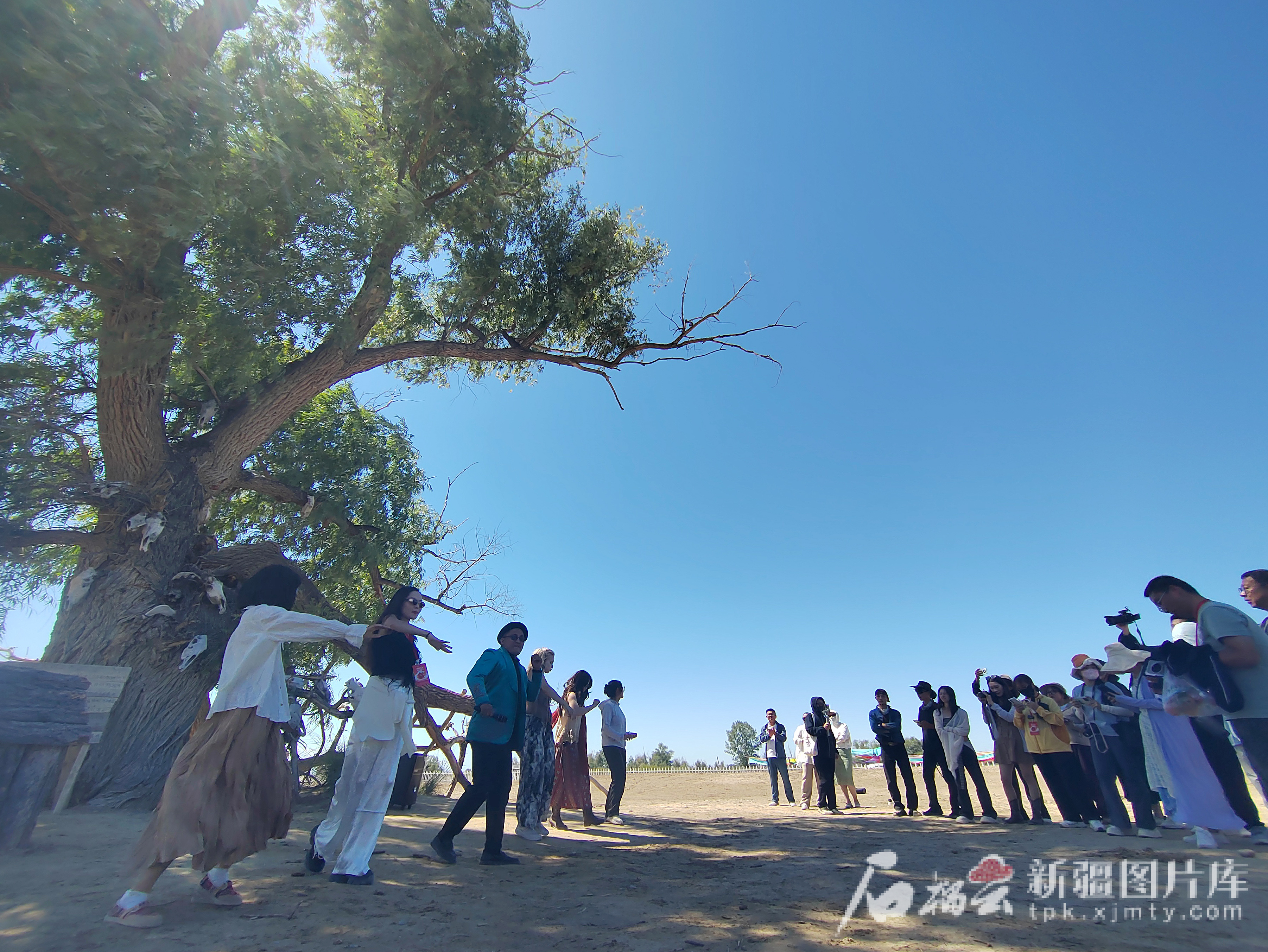 7月25日,采訪團一行在電視劇《我的阿勒泰》取景地彩虹布拉克景區(qū)內(nèi)的“巴太樹”下與游客互動。