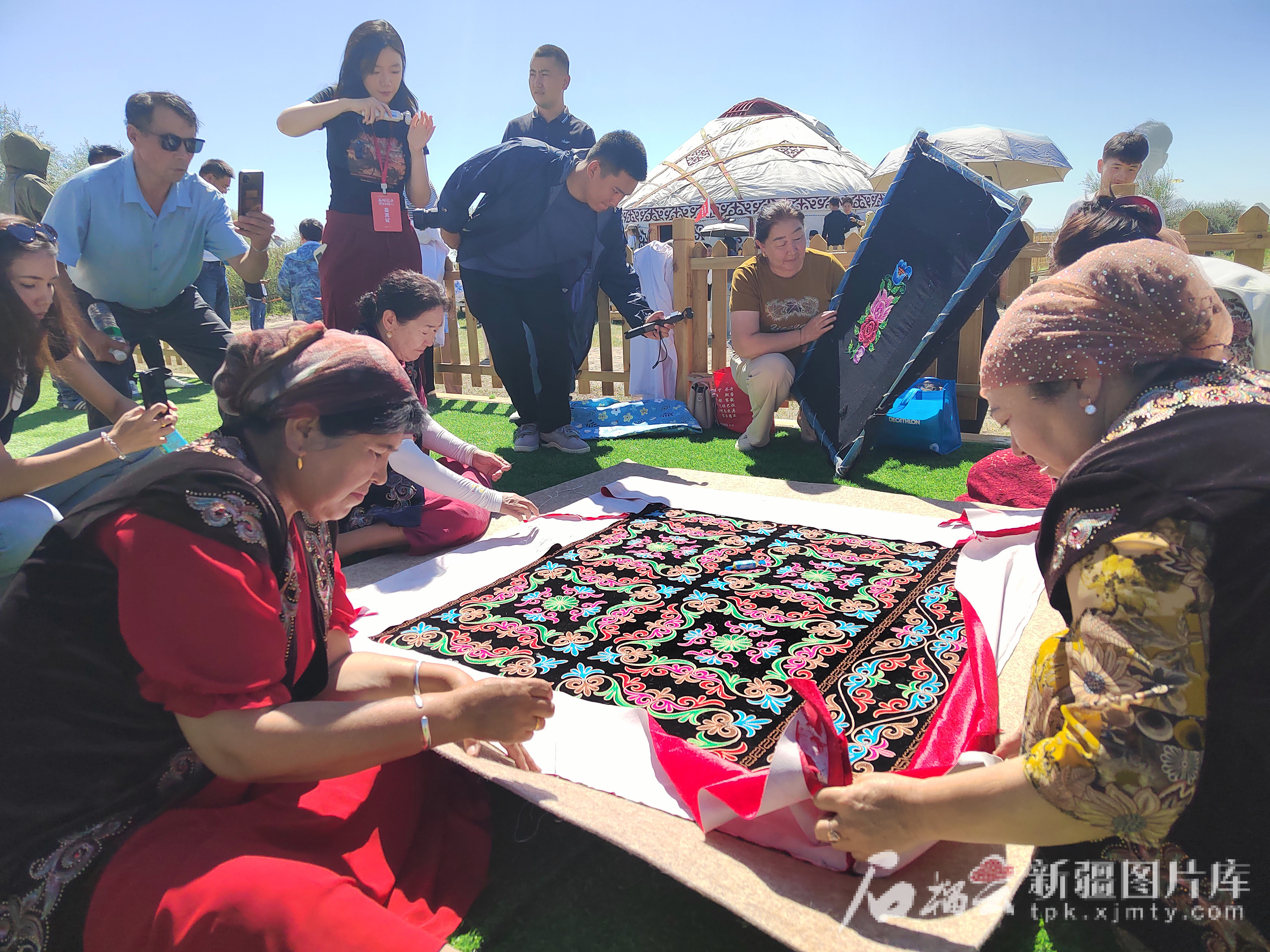 7月25日,采訪團一行在彩虹布拉克景區(qū)拍攝傳統(tǒng)刺繡展示。