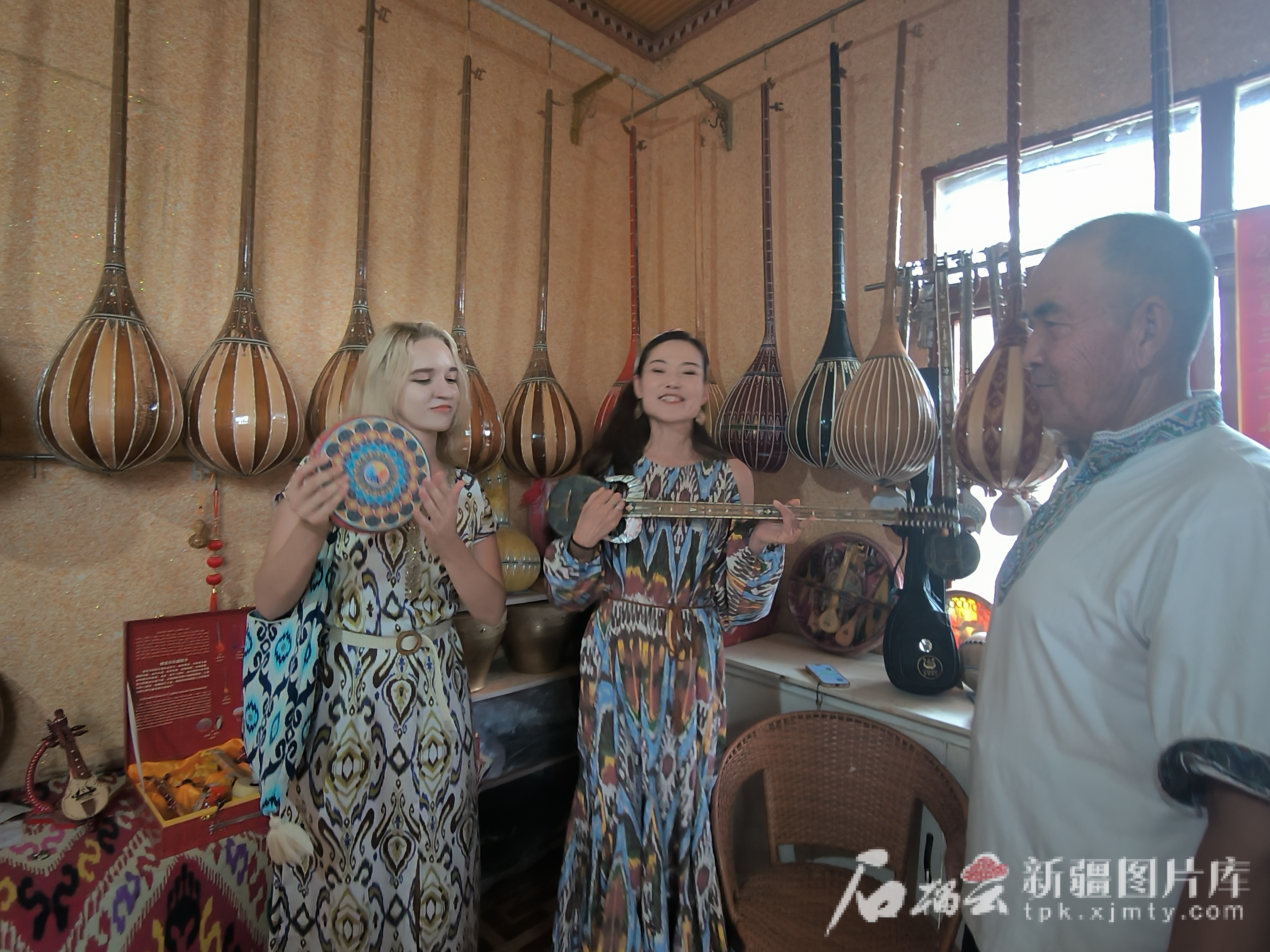 7月28日,在新和縣依其艾日克鎮(zhèn)加依村,俄羅斯籍網(wǎng)絡(luò)達(dá)人梅麗莎(左)和網(wǎng)絡(luò)名人古麗皮亞·買買提依明(中)正在體驗民間手工樂器。天山網(wǎng)-新疆日報記者 甘興華攝