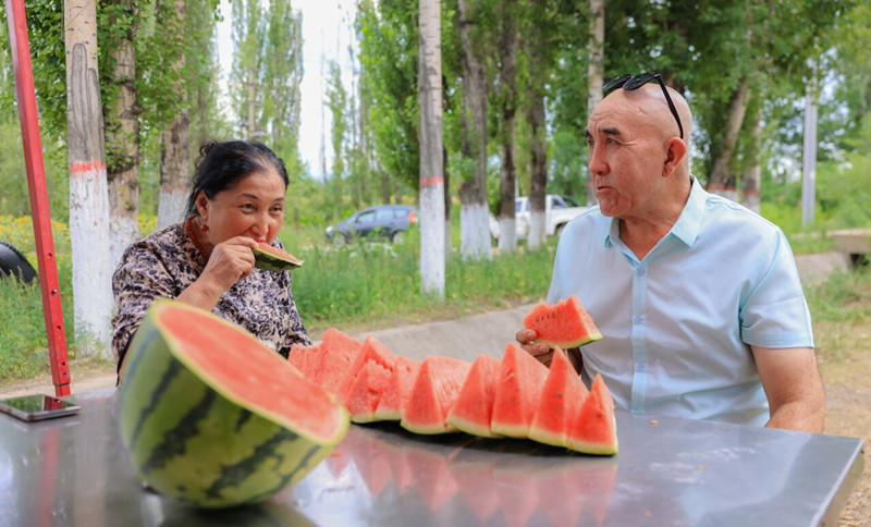 新源縣則克臺(tái)鎮(zhèn)鐵木里克村的雙膜西瓜迎來(lái)成熟期,群眾在地頭品嘗西瓜,消解暑氣。新源縣融媒體中心供圖