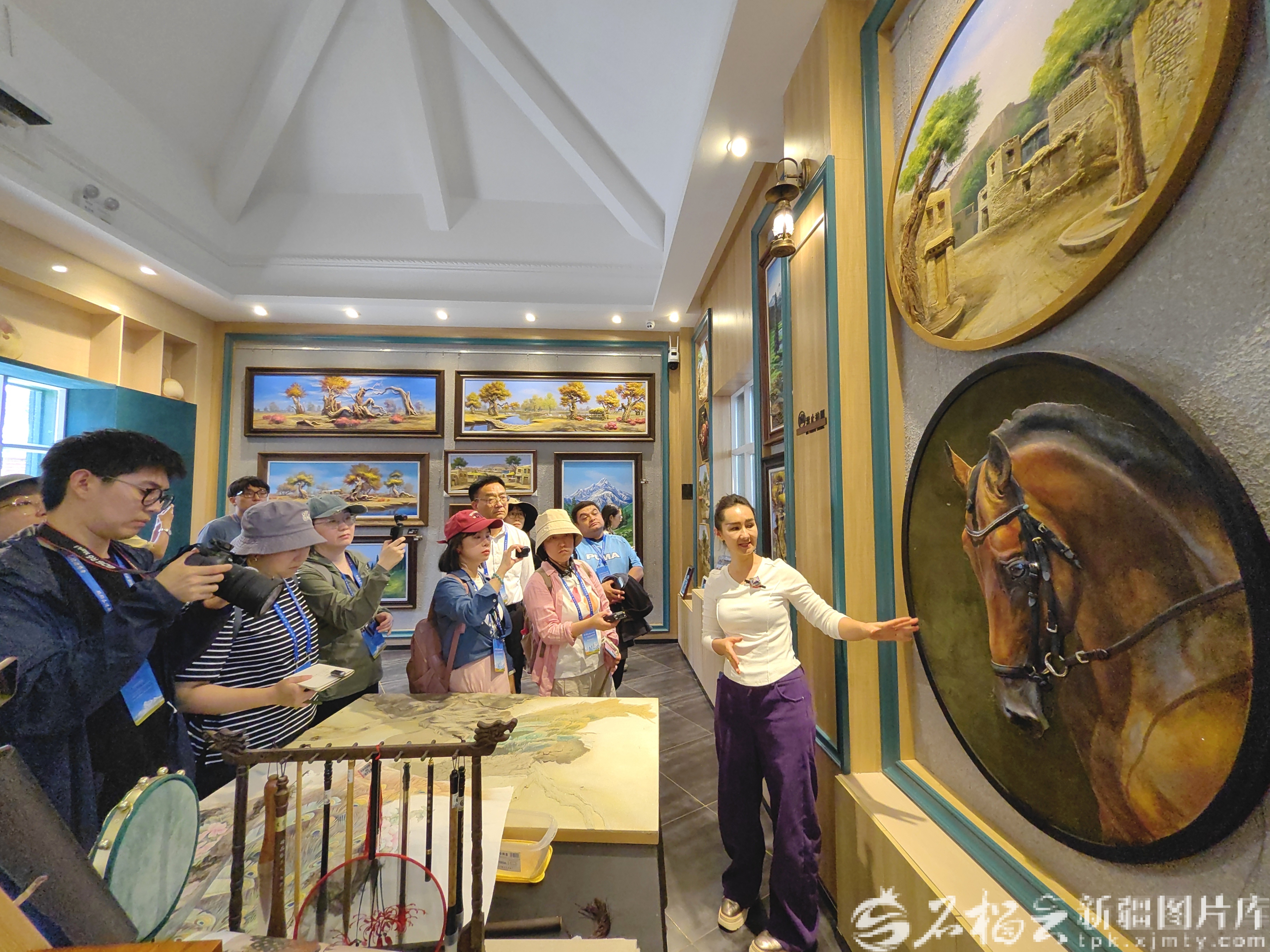 9月8日,采訪團(tuán)在伊寧市六星街景區(qū)彩石畫展覽工作基地采訪。