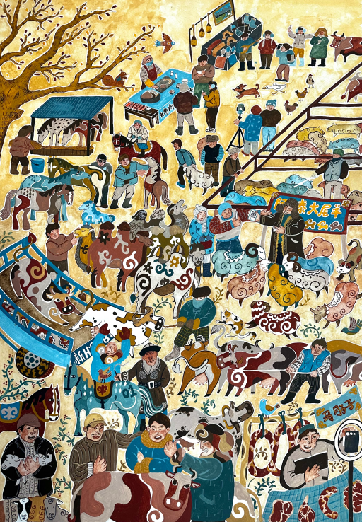 讓我們一同走進(jìn)這些色彩濃烈、質(zhì)樸鮮活的農(nóng)民畫作。每一筆都浸潤著創(chuàng)作者對鄉(xiāng)土生活的深情,每一幅都定格了新疆農(nóng)牧民的喜悅與奮斗足跡。這些作品以最生動的視覺語言,呈現(xiàn)了鄉(xiāng)村振興戰(zhàn)略下新疆大地的豐碩成果與蓬勃生機(jī)。