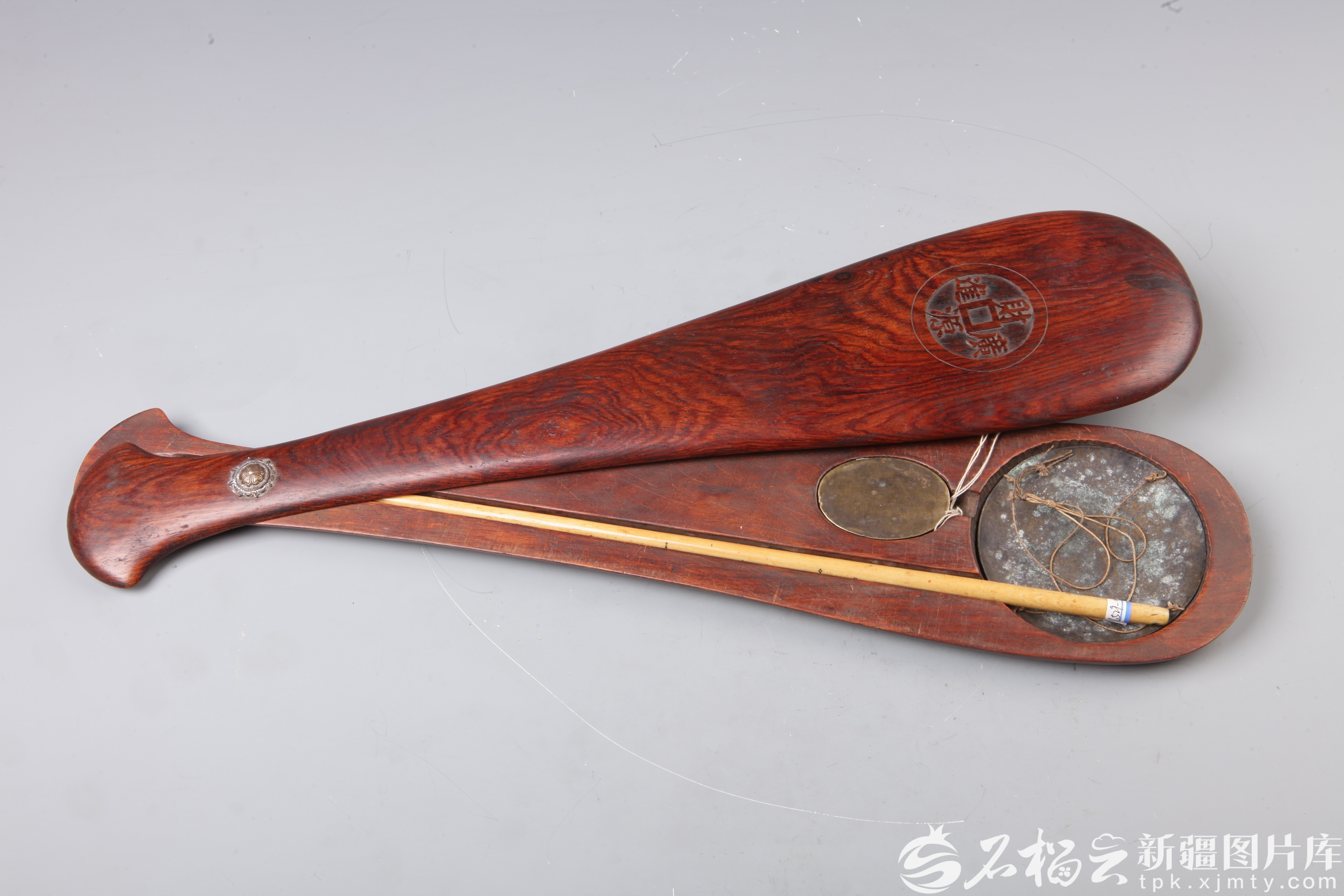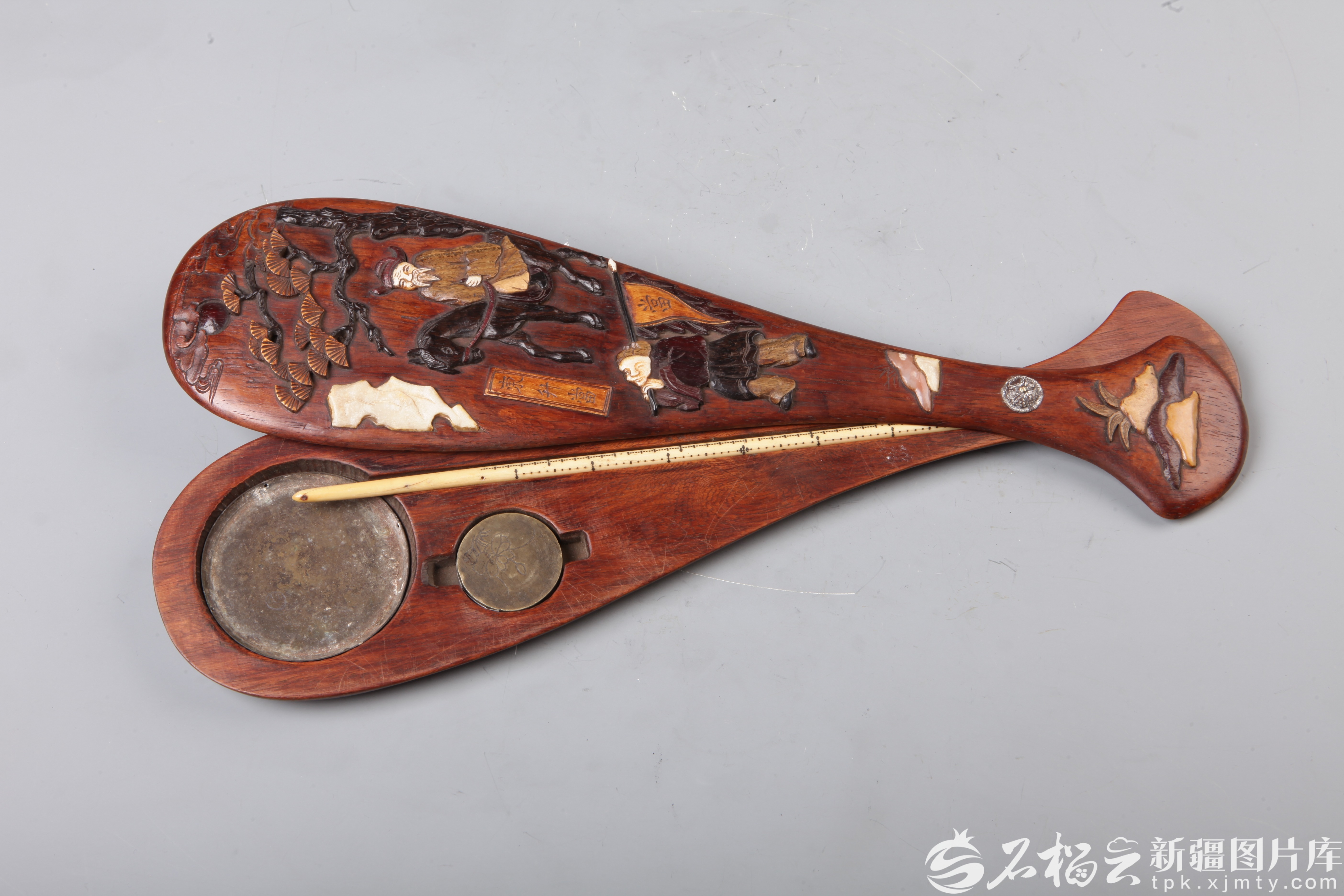 阿克蘇地區(qū)博物館收藏的清代黃花梨戥子,上面用百寶嵌工藝鑲嵌著“馬上發(fā)財”吉祥圖案和“東升當(dāng)”字樣。吳文強供圖