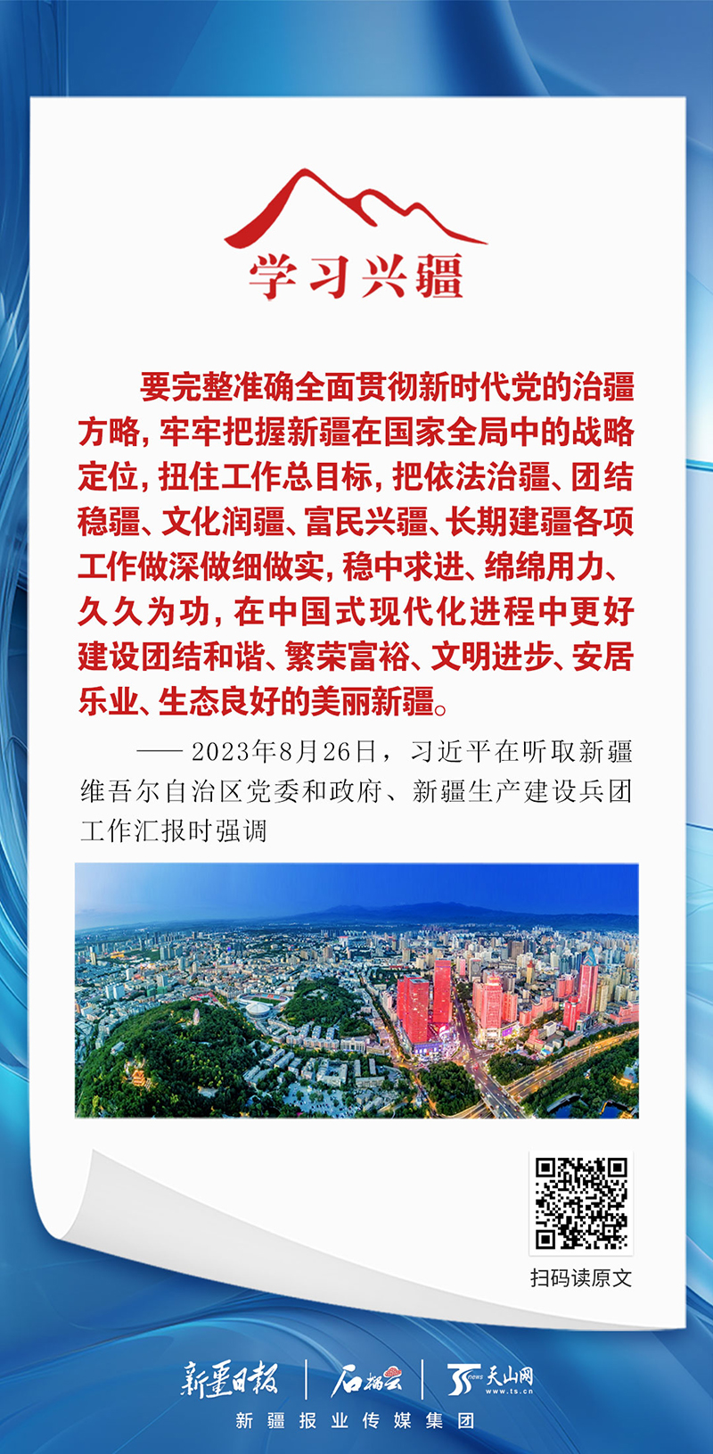 ——2023年8月26日,習(xí)近平在聽取新疆維吾爾自治區(qū)黨委和政府、新疆生產(chǎn)建設(shè)兵團(tuán)工作匯報(bào)時(shí)強(qiáng)調(diào)