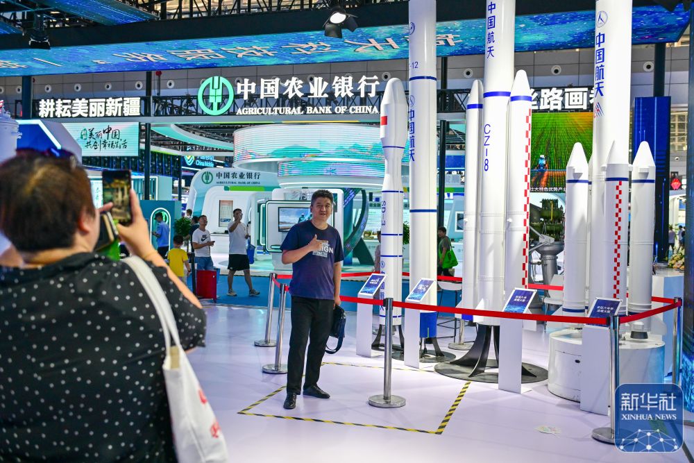 ↑ 6月27日,在第八屆中國-亞歐博覽會上,參觀者在中國航天科技集團(tuán)有限公司展區(qū)與長征系列運(yùn)載火箭模型合影。新華社記者 丁磊 攝