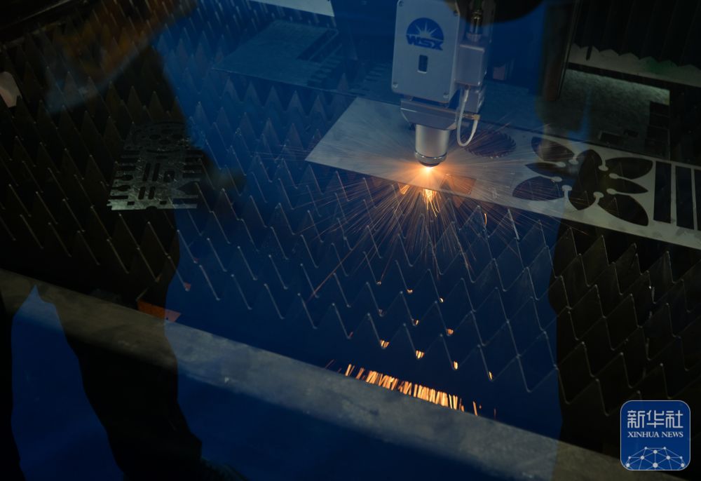 ↑ 6月28日,在第八屆中國—亞歐博覽會上,大鵬激光展臺工作人員展示操作激光切割機(jī)。新華社記者 李任滋 攝