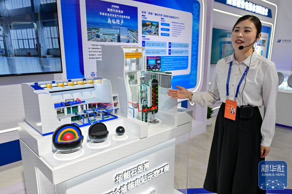 ↑ 6月27日,在第八屆中國-亞歐博覽會上,中國華能展區(qū)的工作人員向參觀者介紹高溫氣冷堆核電站示范工程。新華社記者 丁磊 攝