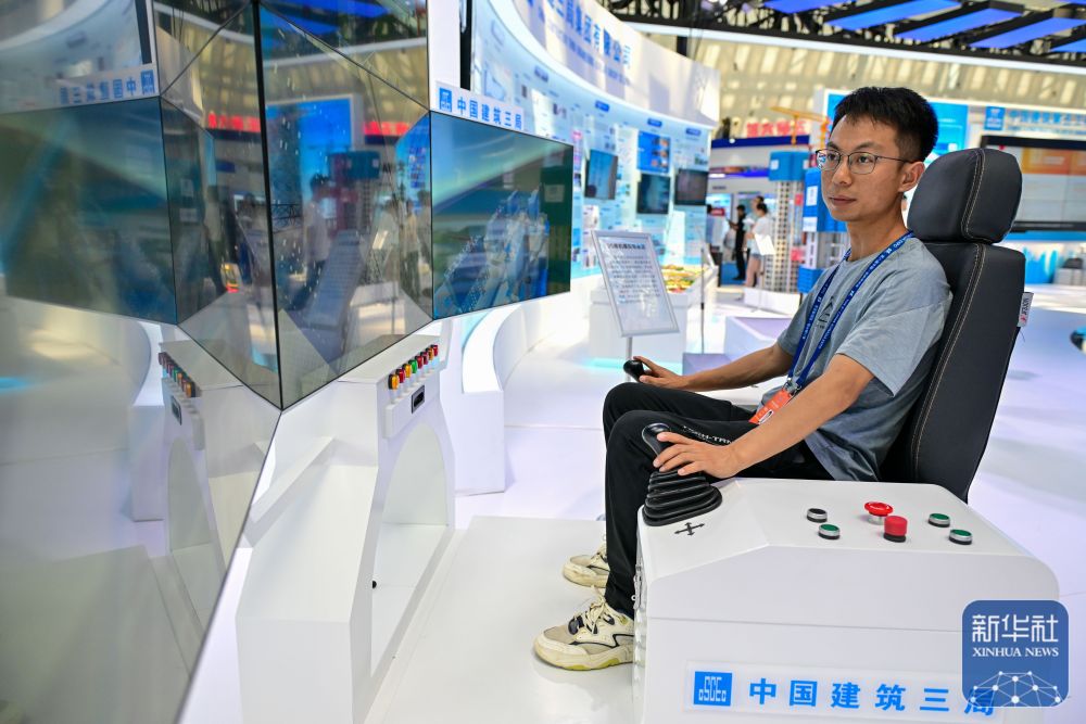 ↑ 6月26日,在第八屆中國—亞歐博覽會上,中建三局展區(qū)的工作人員操作5G塔機(jī)模擬駕駛艙。新華社記者 丁磊 攝