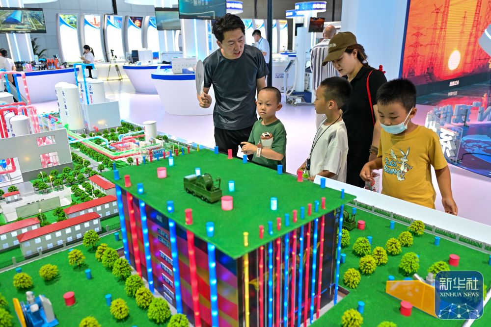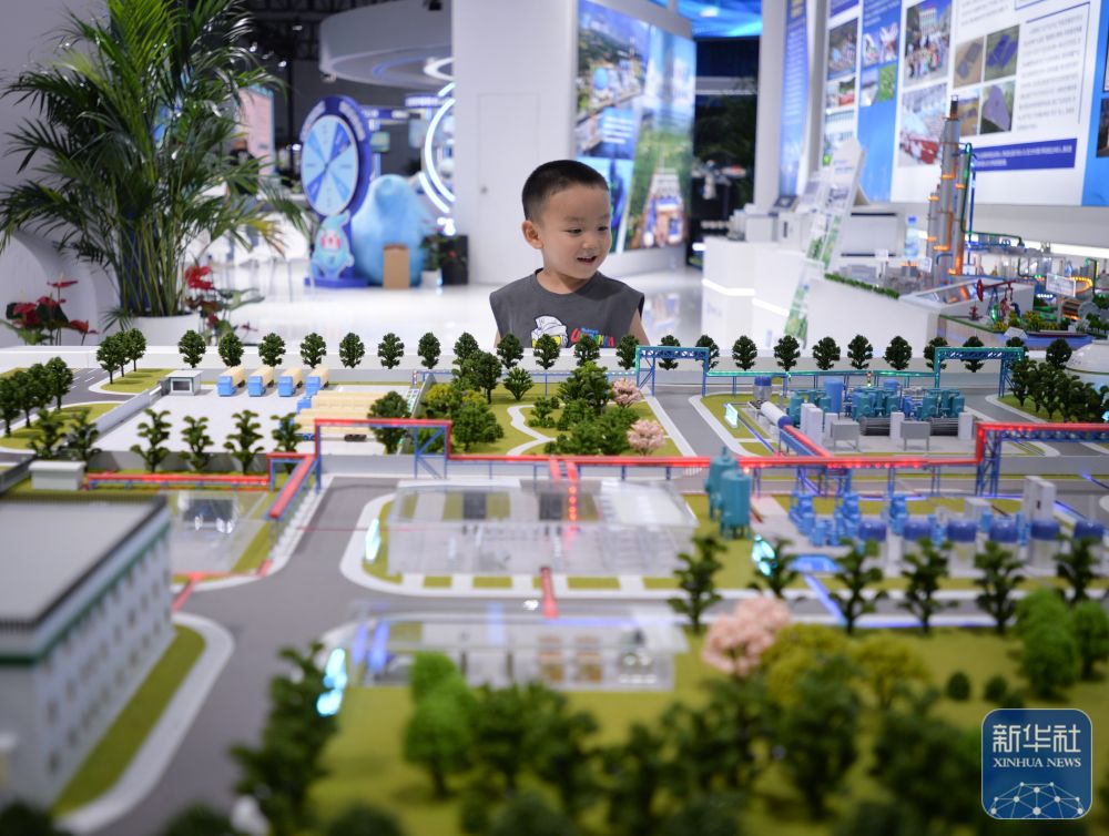↑ 6月28日,在第八屆中國—亞歐博覽會上,一名兒童在華電遼寧鐵嶺風(fēng)電離網(wǎng)制氫一體化技術(shù)研究及示范項目沙盤前駐足觀看。新華社記者 李任滋 攝