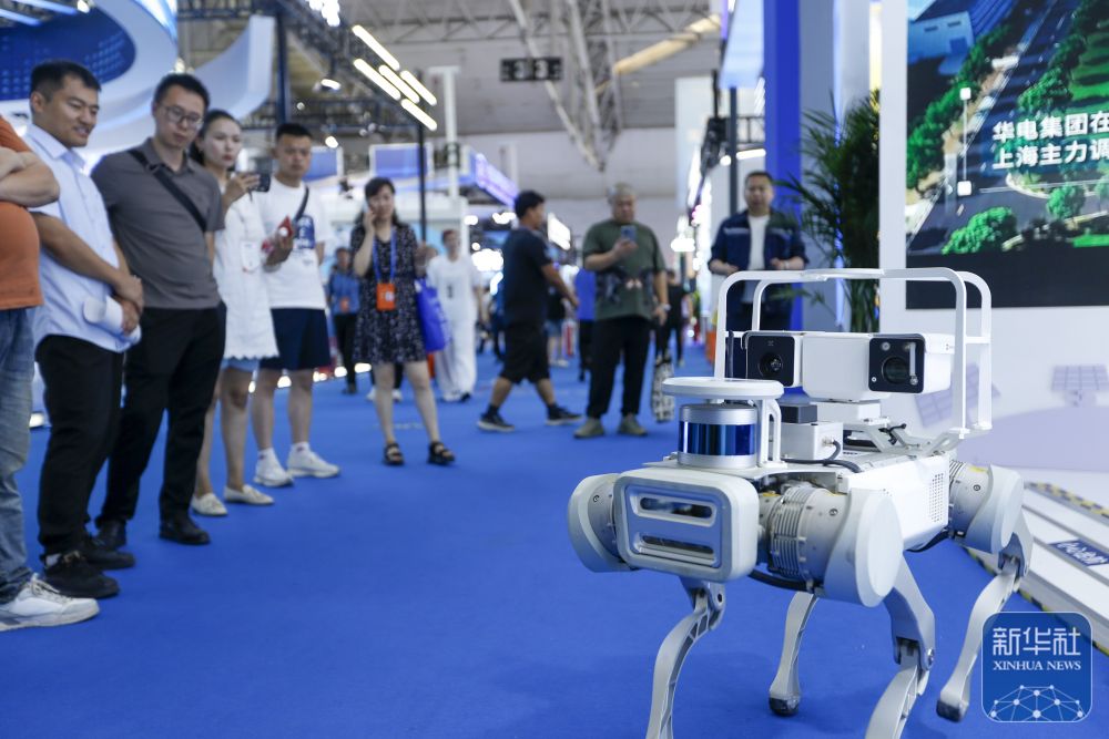 ↑ 6月27日,在第八屆中國—亞歐博覽會上,參觀者在中國華電集團(tuán)展區(qū)觀看巡檢機(jī)器狗展示。新華社記者 陳朔 攝
