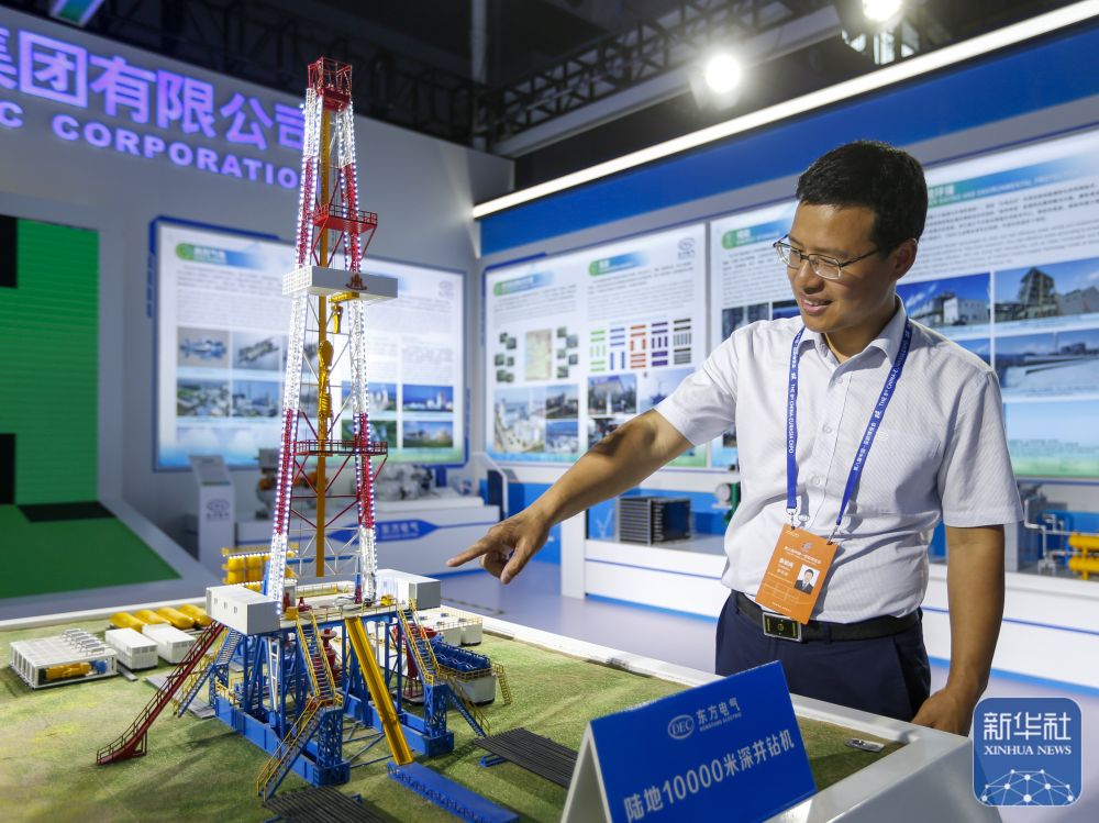 ↑ 6月28日,在第八屆中國—亞歐博覽會上,東方電氣展區(qū)工作人員在介紹陸地10000米深井鉆機(jī)模型。新華社記者 陳朔 攝