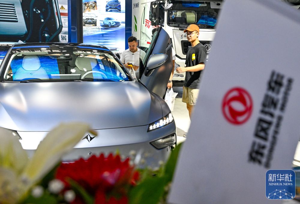↑ 6月28日,在第八屆中國—亞歐博覽會上,參觀者在東風(fēng)汽車展區(qū)了解一款國產(chǎn)新能源汽車。新華社記者 陳朔 攝