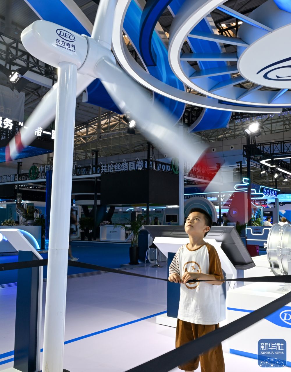 ↑ 6月28日,在第八屆中國—亞歐博覽會上,小朋友在東方電氣展臺了解18兆瓦半直驅(qū)大功率海上風(fēng)電機(jī)組模型。新華社記者 陳朔 攝