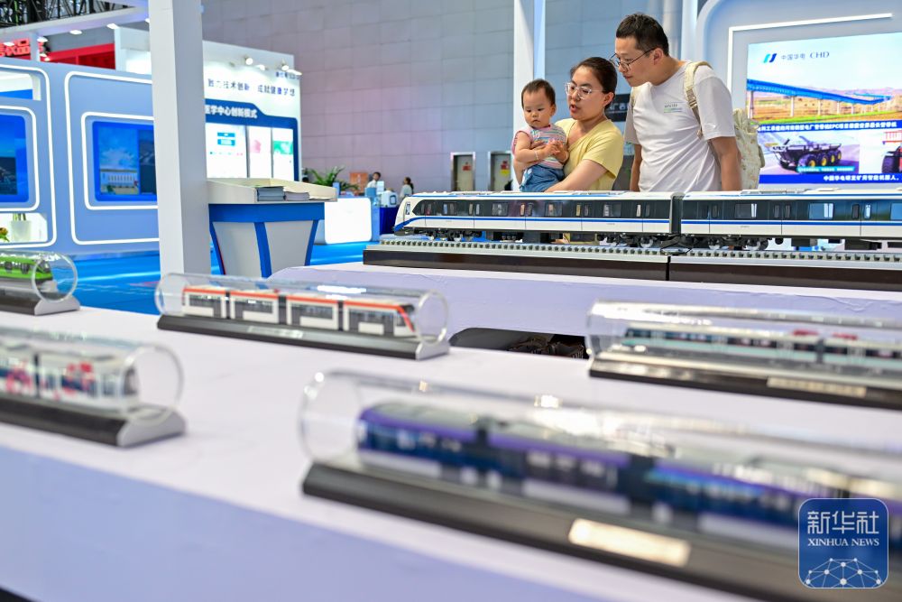 ↑ 6月27日,在第八屆中國—亞歐博覽會上,參觀者在中國中車展區(qū)查看各類車輛模型。新華社記者 丁磊 攝