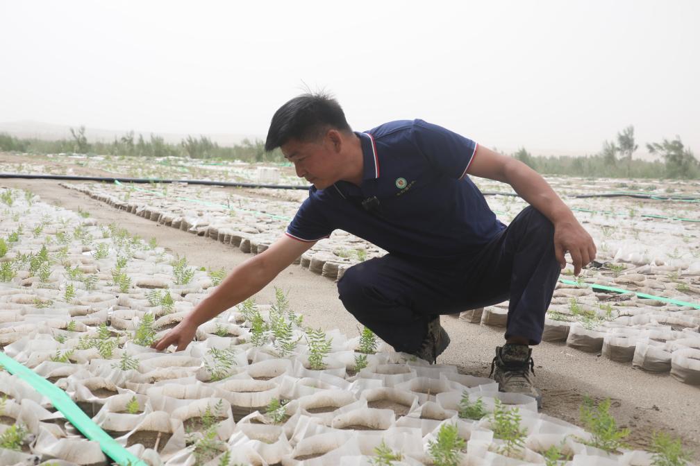 周小珂在老兵治沙隊(duì)文冠果育苗基地打理文冠果幼苗(攝于2025年6月13日)。新華社記者劉詩平 攝