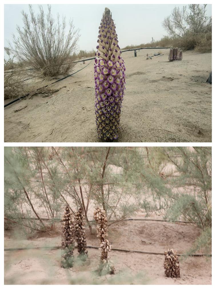 上圖為肉蓯蓉開花(受訪者供圖);下圖為肉蓯蓉開花變干后(攝于2025年6月13日),新華社記者劉詩平 攝