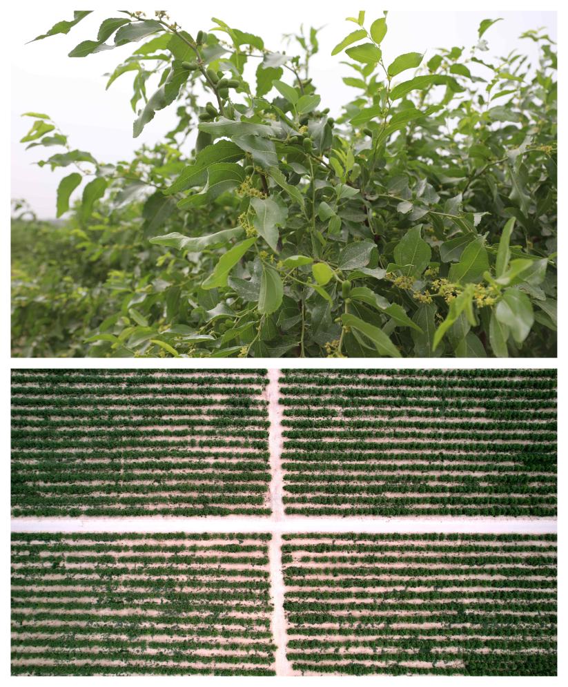 若羌縣萬畝紅棗示范基地的棗林,圖中間為小氣候環(huán)境監(jiān)測站(攝于2025年6月12日)。新華社記者劉詩平 攝