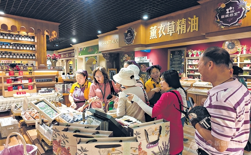 游客在霍城縣清水河鎮(zhèn)解憂公主薰衣草園薰衣草小街購(gòu)買產(chǎn)品(7月3日攝)。張柏年攝