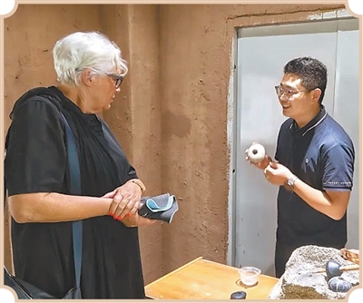 奧地利自然博物館館長維拉·海默(左)參觀昆侖古事館。章文夢迪攝