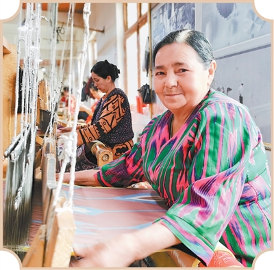 絲綢之路興起后,從和田向西的路段,很大一部分與玉石之路重合。而在和田,中外交流自古就不僅限于玉石。早在千年前,和田人民已掌握養(yǎng)蠶織綢技藝,生產(chǎn)的絲綢活躍于絲綢之路貿(mào)易中。這其中,艾德萊斯綢尤為著名。