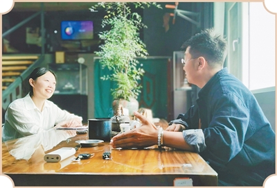 記者采訪和田玉雕刻師聶明禮(右)。陳玥攝