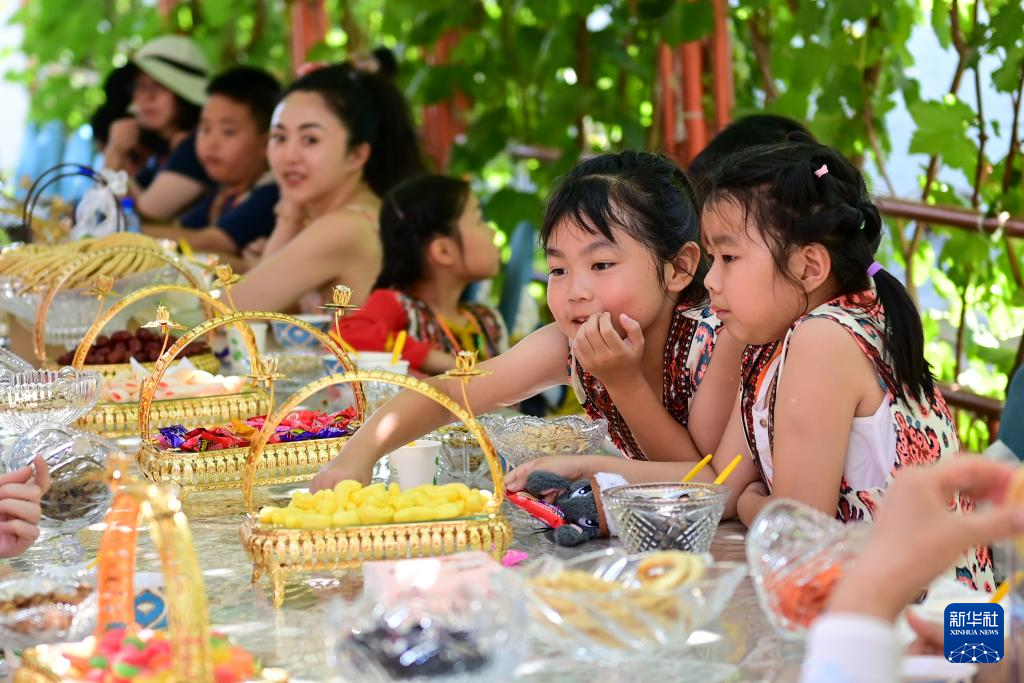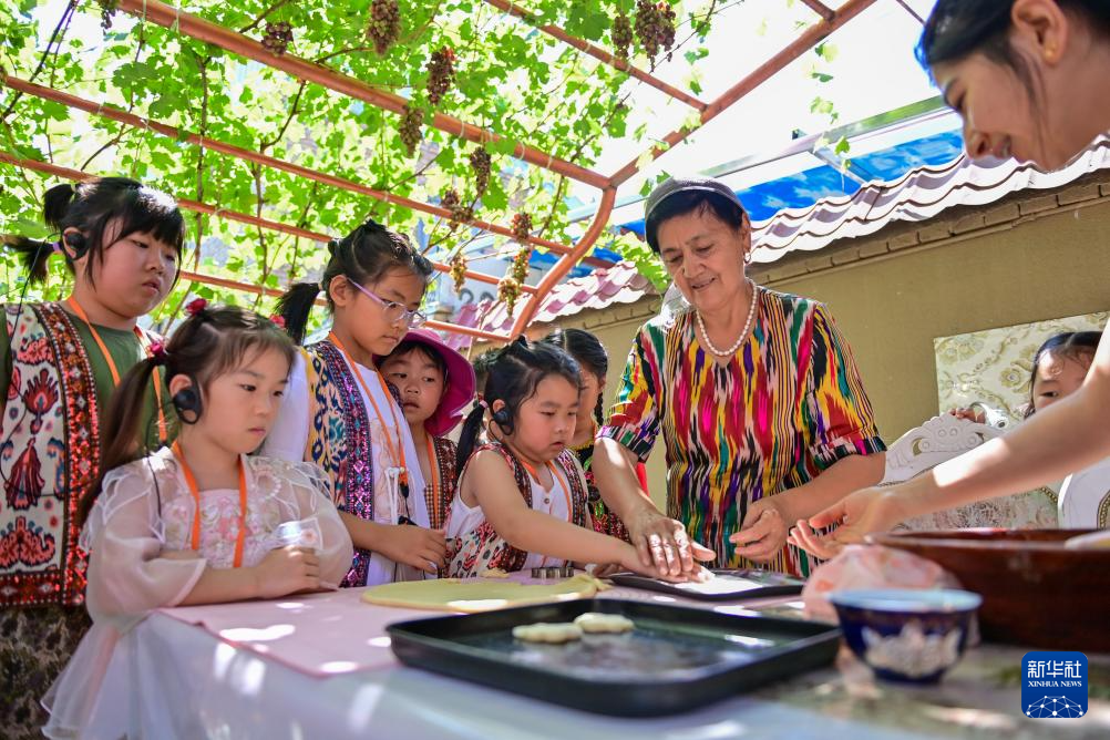 研學(xué)游的小朋友在新疆伊犁哈薩克自治州伊寧市伊犁老城喀贊其文化旅游區(qū)學(xué)做當(dāng)?shù)靥厣恻c(diǎn)(7月23日攝)。新華社記者 丁磊 攝