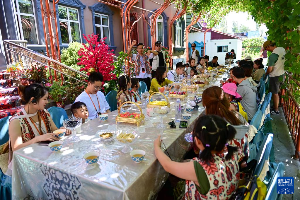 游客在新疆伊犁哈薩克自治州伊寧市伊犁老城喀贊其文化旅游區(qū)家訪點(diǎn)品嘗當(dāng)?shù)孛朗常?月23日攝)。新華社記者 丁磊 攝