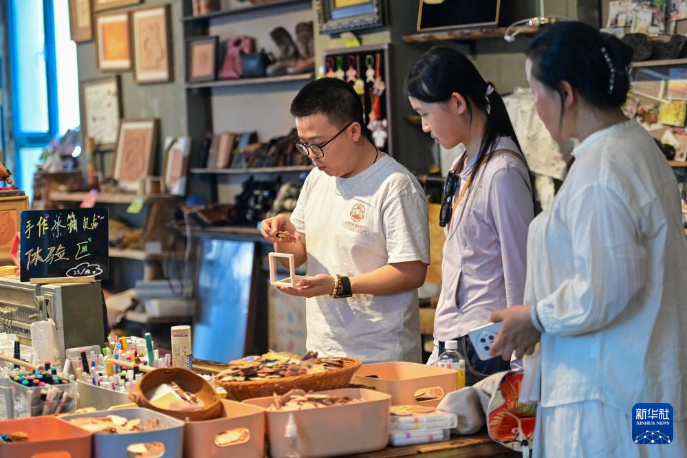 游客在新疆伊犁哈薩克自治州伊寧市伊犁老城喀贊其文化旅游區(qū)傳統(tǒng)技藝展示區(qū)挑選商品(7月23日攝)。新華社記者 丁磊 攝