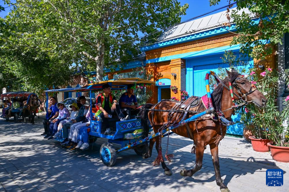 游客在新疆伊犁哈薩克自治州伊寧市伊犁老城喀贊其文化旅游區(qū)乘坐馬車觀光游覽(7月23日攝)。新華社記者 丁磊 攝