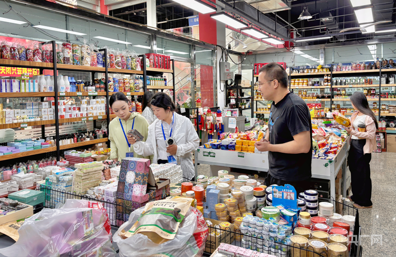記者走進(jìn)塔城市中哈邊民互市絲路文化商品城,撲面而來的是熙攘的人潮,與熱鬧的討價還價聲。貨架上,俄羅斯巧克力、哈薩克斯坦蜂蜜、吉爾吉斯斯坦羊毛毯琳瑯滿目,游客們正穿梭于貨架中,不時拿起商品仔細(xì)端詳。