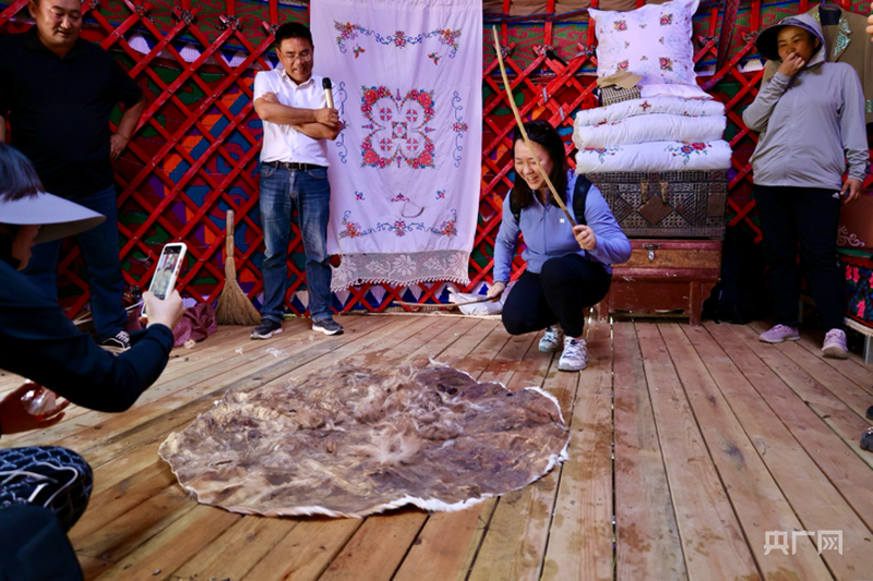 在哈薩克族特色氈房,游客體驗打羊毛活動(央廣網(wǎng)記者 梁瑜琳 攝)